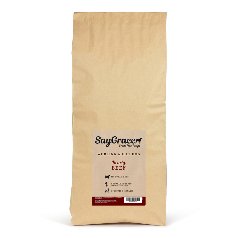 SayGrace embodies our commitment to promoting health and vitality in every meal.  SayGrace Hearty Beef is thoughtfully crafted to deliver complete nutrition with irresistible flavour. Containing 50% total beef, including 28% freshly prepared Angus Beef, this recipe provides a high-quality protein source to support your dog’s strength and vitality.