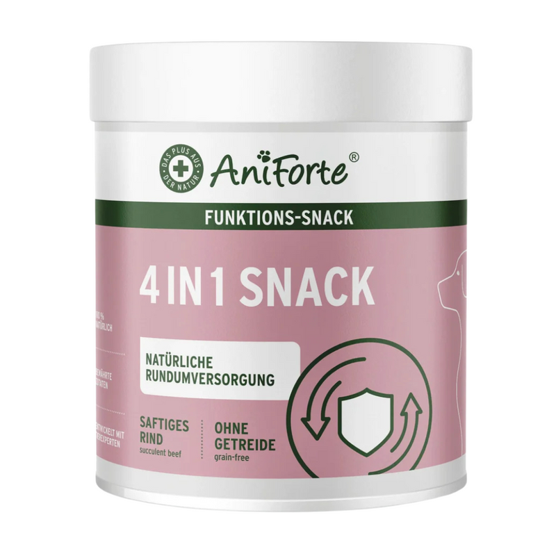AniForte 4in1-Snack provides comprehensive care for your dog's coat and skin, immune system, mobility, and digestion—all in one delicious treat. High in meat content with 100% natural ingredients and no artificial additives.