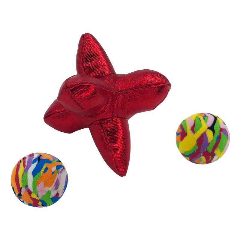 The KONG Cat Active Jacks Toy gives triple the fun with three lightweight toys that spark your cat's natural hunting instincts. Fast-rolling, bouncy balls and an easy-to-flip jack, this set of toys invites endless pouncing, batting, and chasing play.