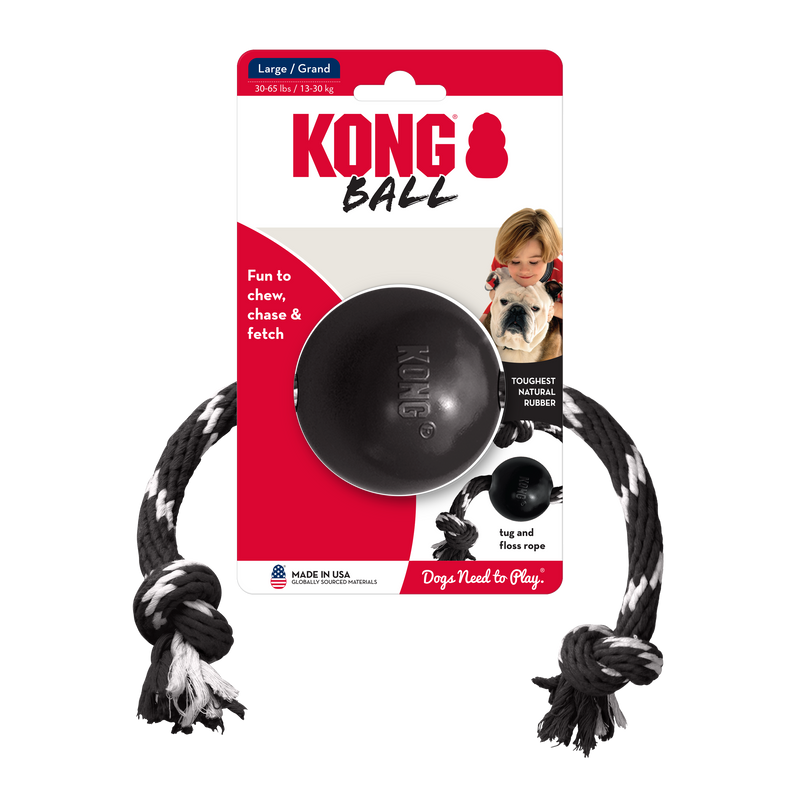 The Extreme KONG Ball with Rope adds long-lasting diversity to games of fetch and tug. Made from KONG Extreme rubber, the ball is designed for durability for long-lasting interactive play. The 100% cotton rope also rewards appropriate chewing behaviour while massaging teeth and gum. All of this adds up to playful bouts of mentally stimulating and enriching engagement.