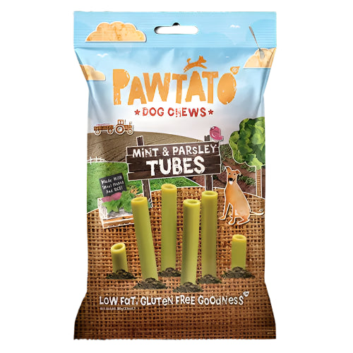 Give your dog a delicious and refreshing treat with Pawtato Mint & Parsley Tubes! These plant-based, rawhide-free chews are made from nutritious sweet potato and rice, blended with natural mint and parsley to help freshen breath while providing a satisfying chew. These low-fat, hypoallergenic treats are gentle on sensitive stomachs and completely free from meat, wheat, dairy, and artificial additives. With a firm texture, they also help promote healthy teeth and gums.