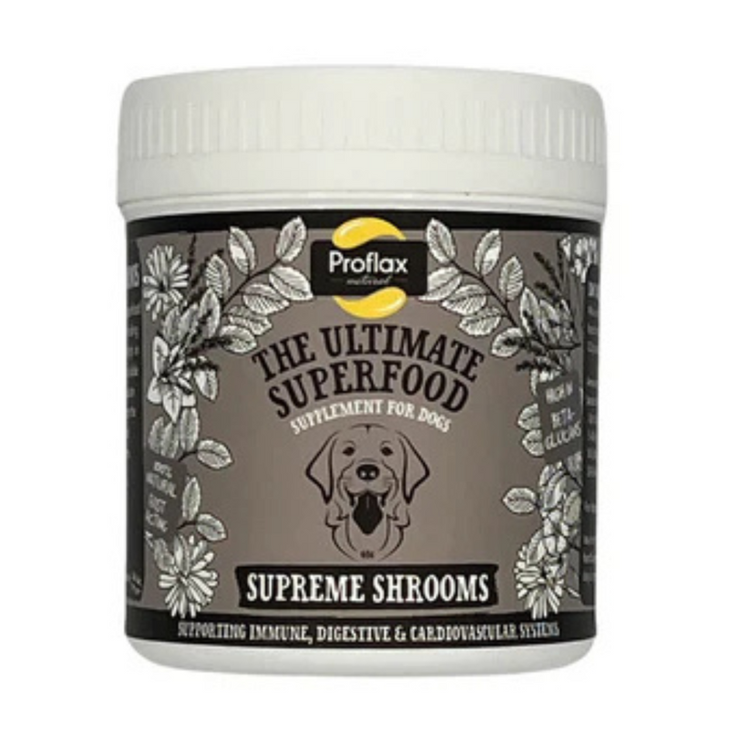 Give your dog’s health a natural boost with Proflax Supreme Shrooms, a powerful blend of five organic, concentrated mushrooms designed to strengthen immunity, support heart health, and promote overall well-being. This vet-approved formula is perfect for dogs with low immunity, recovering from illness, or needing extra digestive and liver support. Made in the UK using only the highest quality fruiting body mushrooms, rich in beta-glucans, this supplement is fast-acting and highly effective.